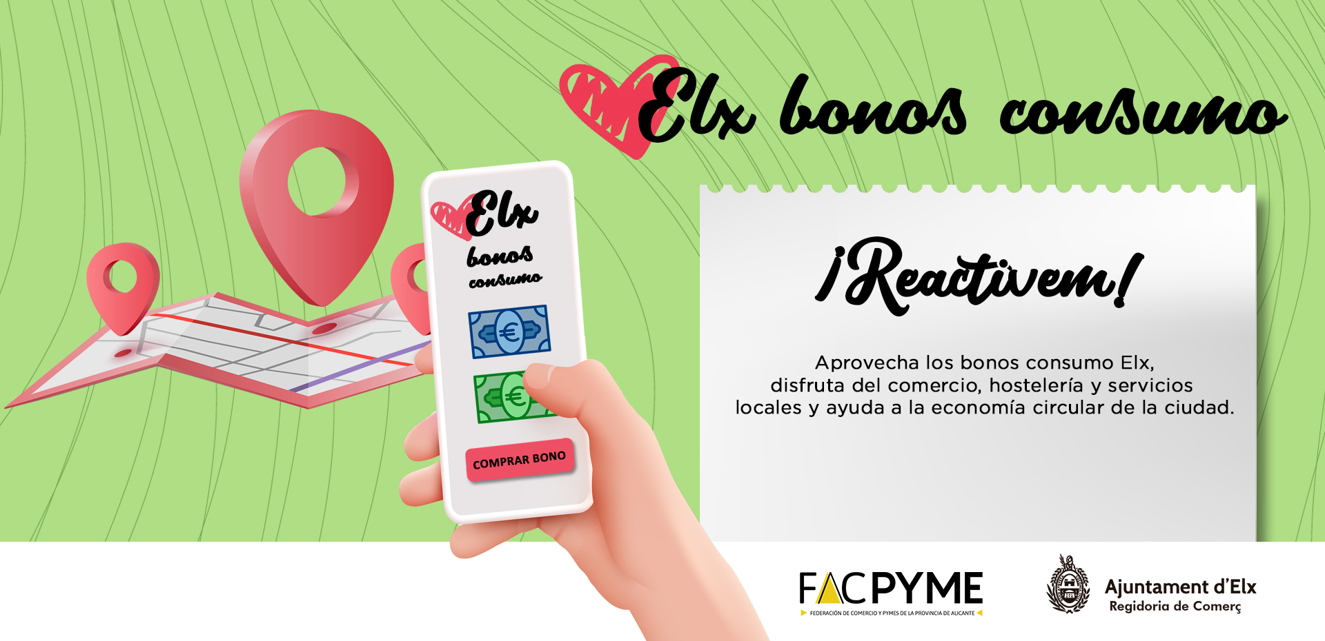 "BONOS CONSUMO REACTIVEM" es una iniciativa puesta en marcha por el Ayuntamiento de Elx, en colaboración con la Federación Alicantina de comercio y la Pyme - FACPYME. Surge para incentivar el consumo en nuestros comercios, servicios y hostelería, y dinamizar la actividad económica del municipio.